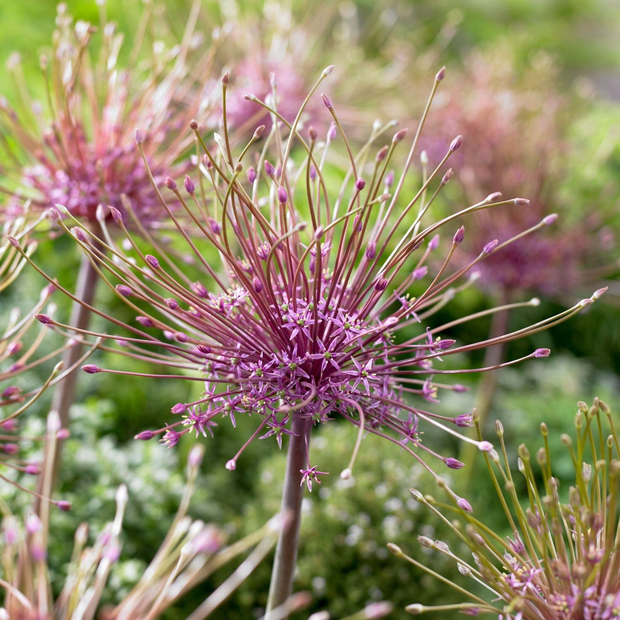 'Schubertii' ist eine wahre Blütenexplosion und ein botanischer Blickfang, der Struktur und Fantasie in einem dramatischen Auftritt vereint. Er blüht im Mai und Juni mit riesigen, feuerwerksähnlichen Blütenständen, bei denen jede sternförmige Einzelblüte an unterschiedlich langen Stielen sitzt und so einen spektakulären, dreidimensionalen Effekt entstehen lässt. Die Blüten zeigen ein gedämpftes Rosa mit metallischem Schimmer, und die Kugeln können bis zu 30 cm Durchmesser erreichen.